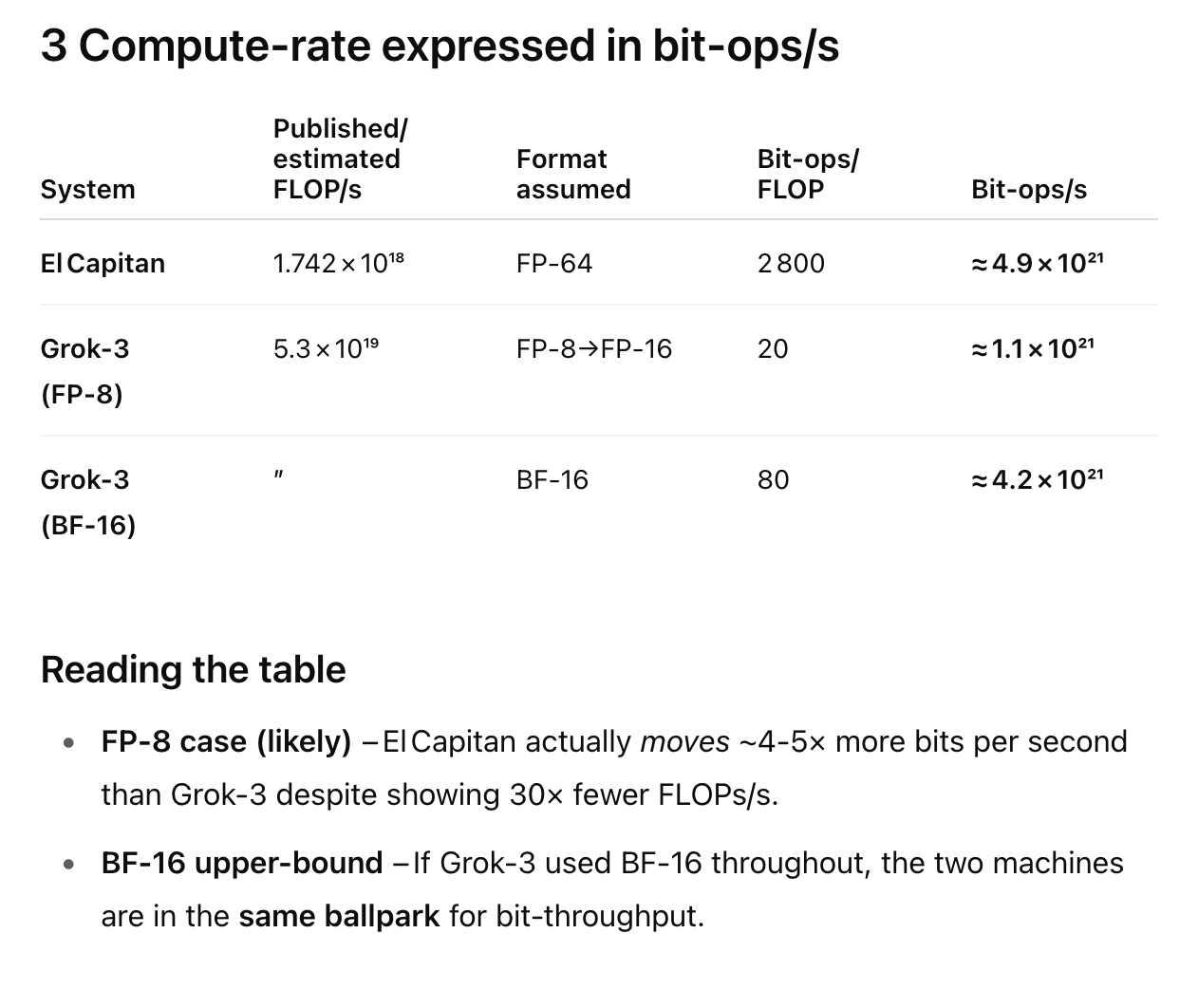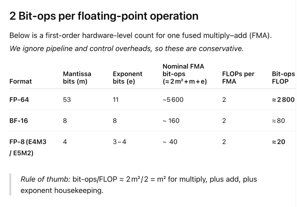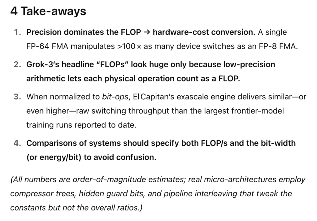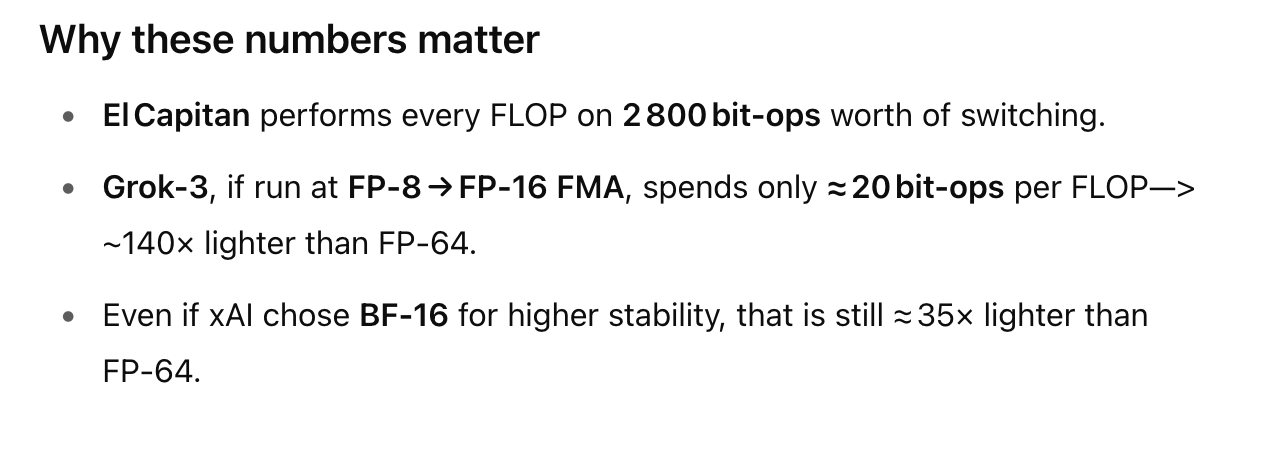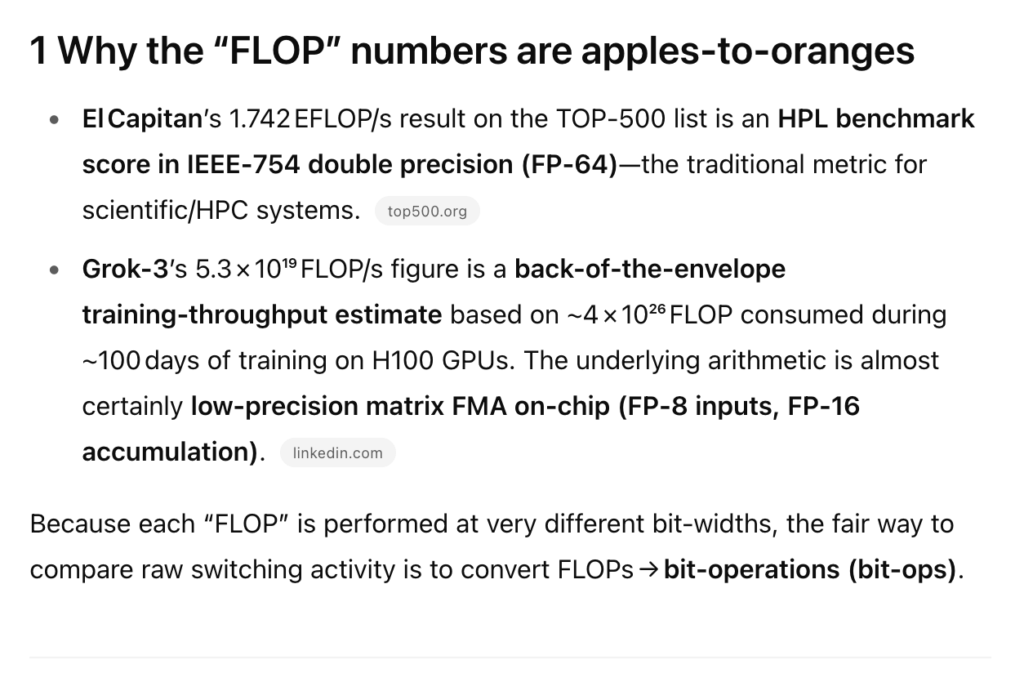 At this point, readers are likely howling with indignation. He’s going apples-to-apples with flops between two radically different computational paradigms! Johnny von Neumann rolls in his early grave.