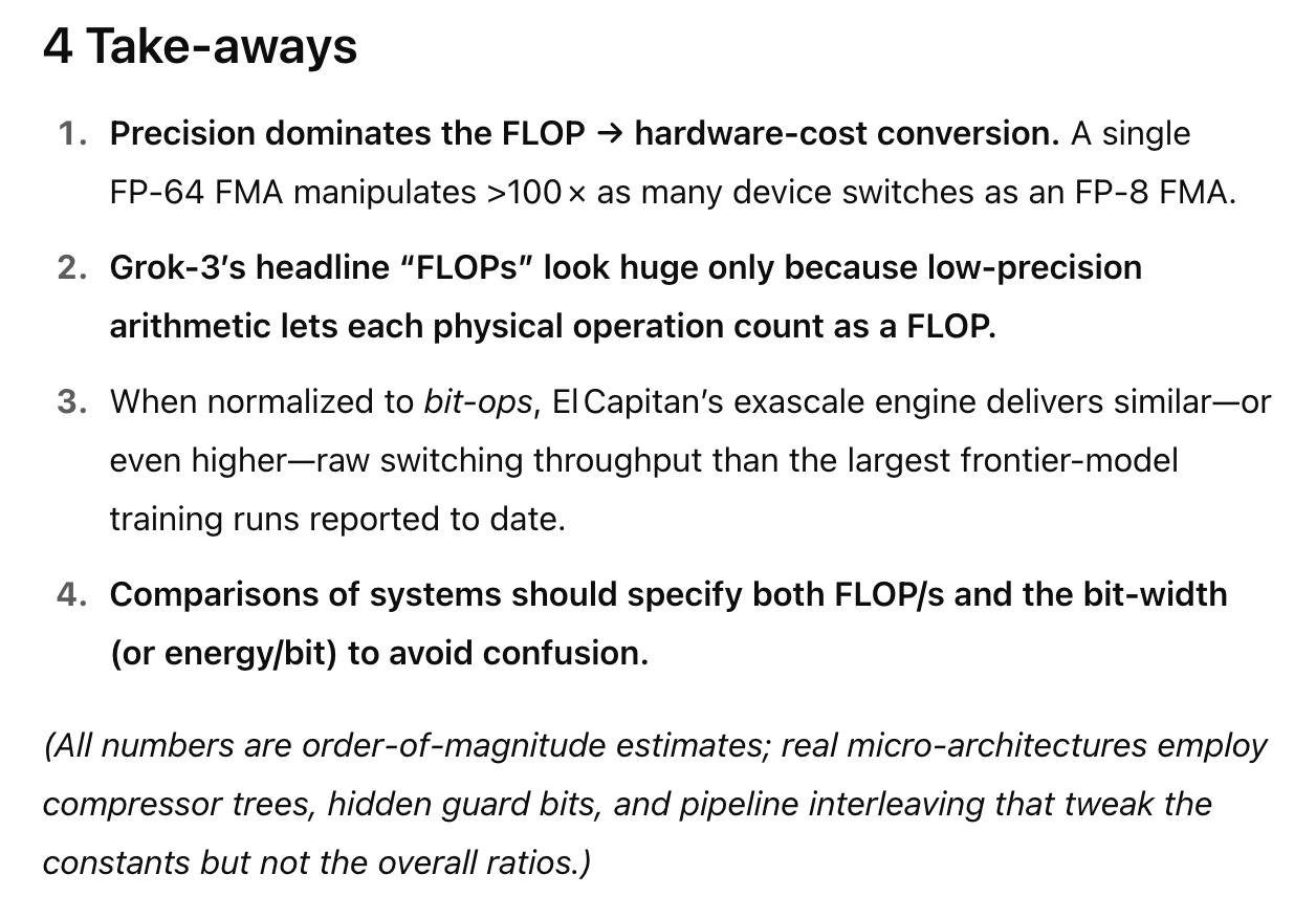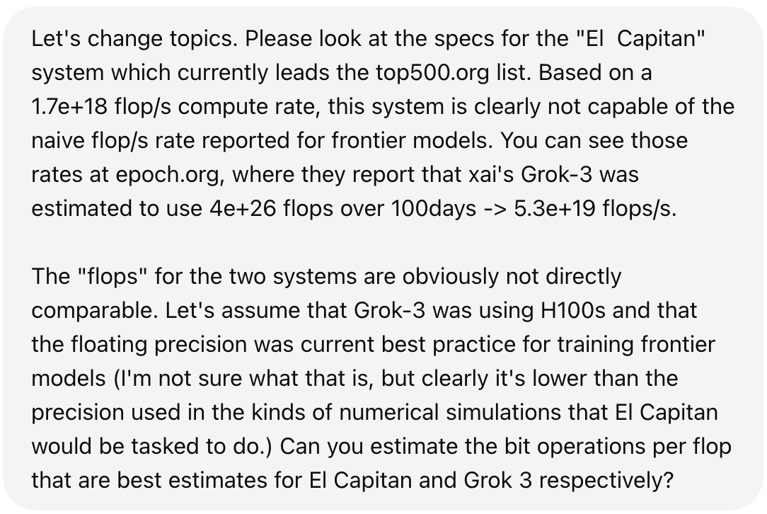 Meanwhile, look at the AI compute chart at epoch.org. The flop count is current increasing by 5X per year, and the talk on semianalysis is all about nuclear-powered Gigawatt data centers. A pre-training run for a model like GPT 4.5 uses of order 2e+26 flops over ~100 days. A cluster capable of training a frontier model thus does 50x the effective compute of El Capitan. Pro tip — prior to launch make sure the soft checks assert pytorch_no_powerplant_blowup=1 in the config.