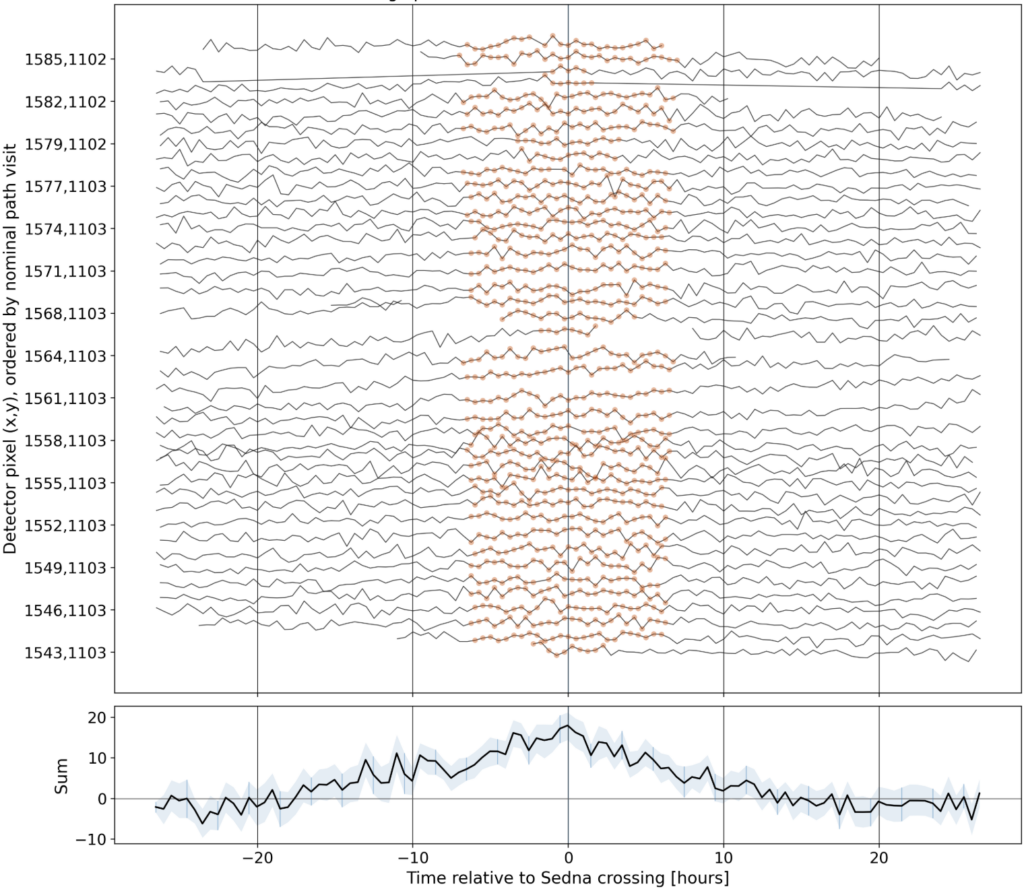 This is not a particularly easy feat. You have to understand the TESS data structures and frame registration. You have to do a careful job with background noise, background stars, and fairly daunting systematics that stem from the spacecraft’s observing cycle. You need to correctly calculate how Sedna will move across the frame during the period of observation.