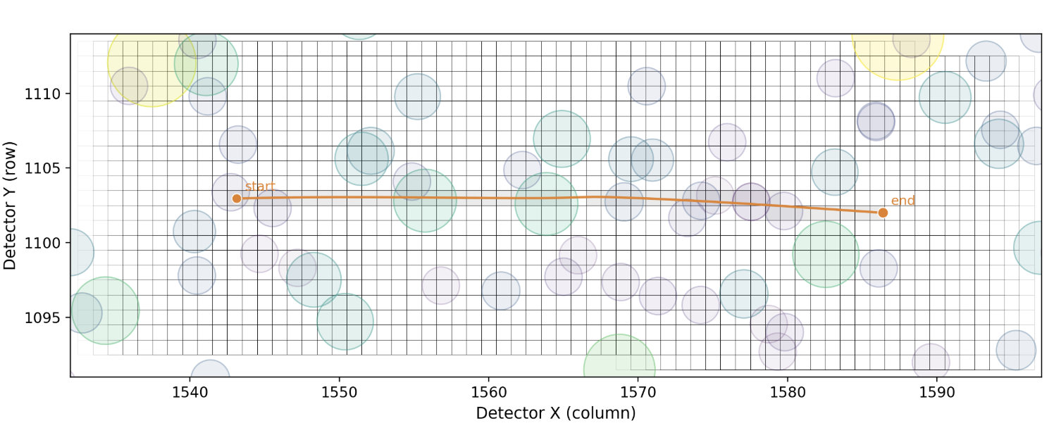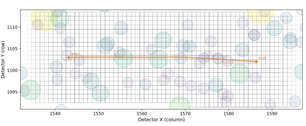 In the above image, the background stars (12th through 17th magnitude) in the field are shown with their approximate footprints on the pixels, with Sedna’s track during sector 5 running from left to right. The agent focused on the pixels holding the Sedna’s centroid, and produced a clever visualization of the dwarf planet’s trace through the data: